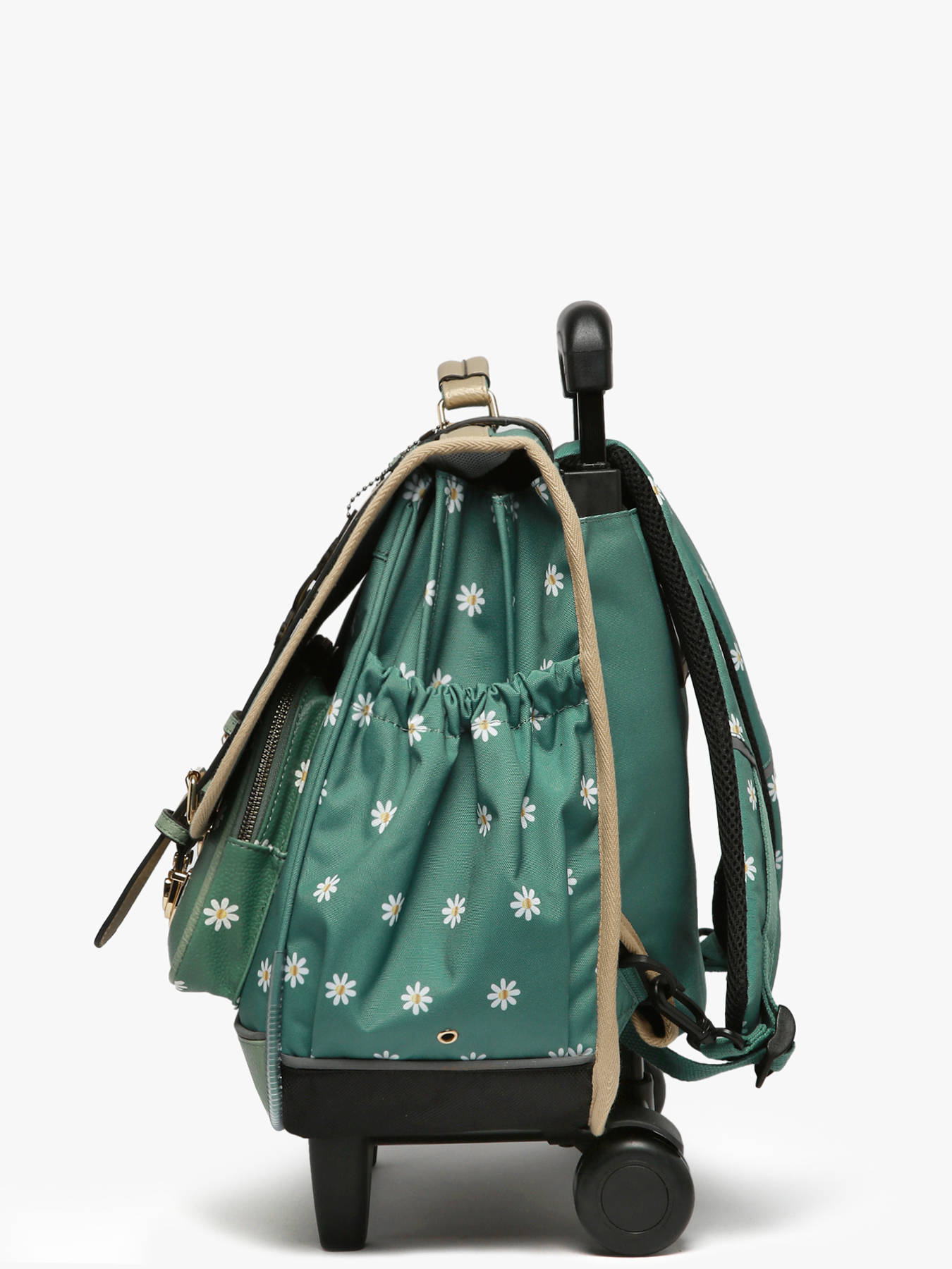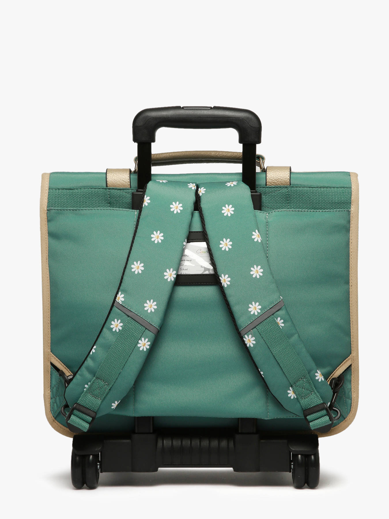 41 cm - 31 liters - 2.6 kg ~ This 41 cm, 3-compartment wheeled school bag from the Vintage Fantasy line by Caméléon is perfect for CM1 and CM2 students. Loved for its large storage capacity, it features three compartments that can hold notebooks and binders up to 32x29x7 cm, along with an interior zipped pocket. On the outside, it includes two front zippered pockets and a side bottle holder. A reflective strip on the front ensures your child’s safety. The bottom and sides are reinforced for daily use. It can also be worn as a backpack thanks to the detachable shoulder straps stored in the back pocket and the padded protection over the wheel frame to protect your child's back. For optimal support, the shoulder straps and back are padded. As a bonus, this school bag includes a name tag, a free ruler, and a fun chameleon keychain on the handle !