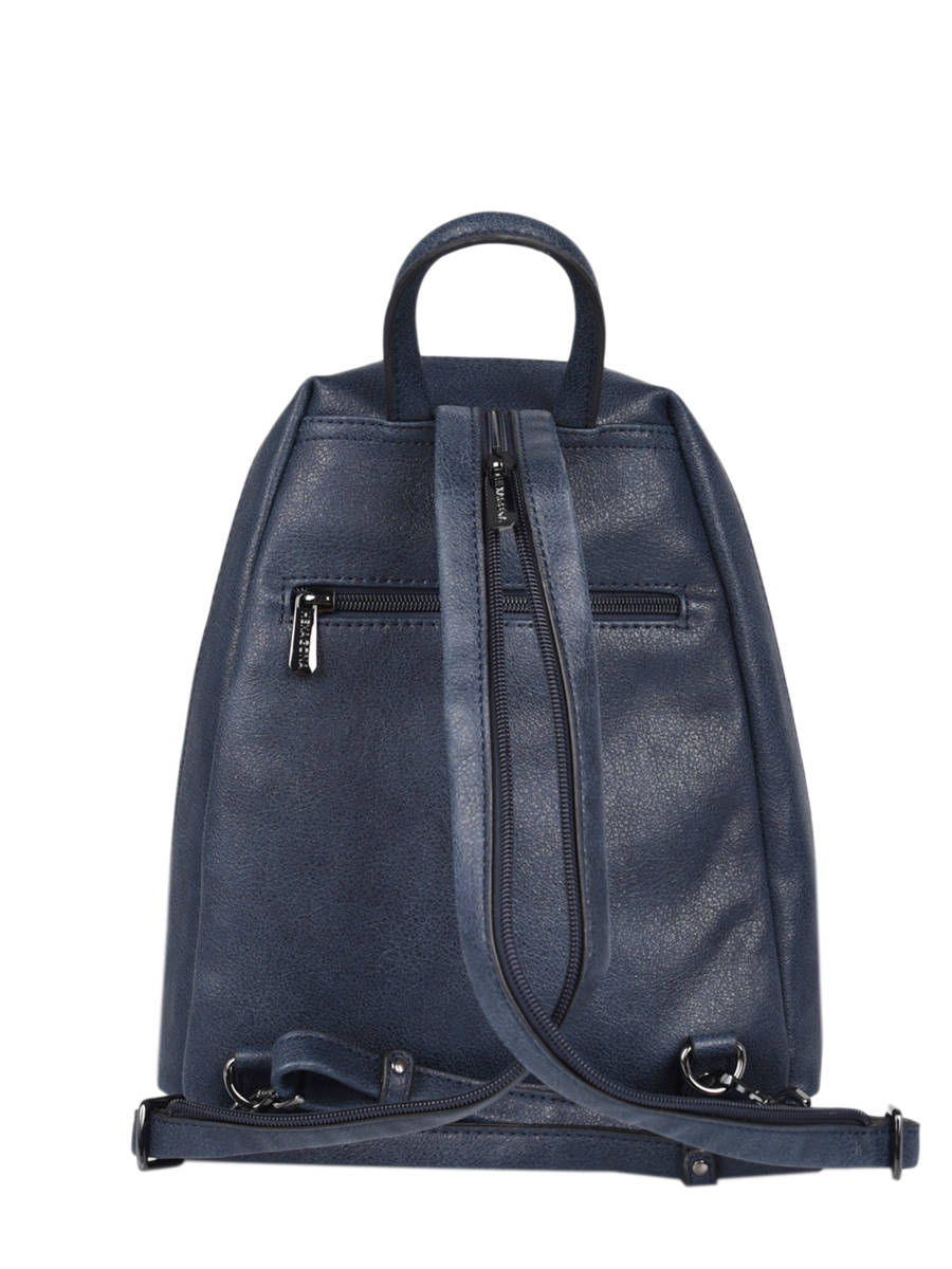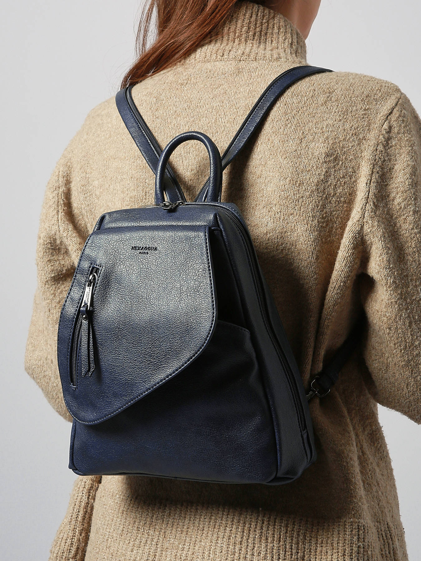 We at Edisac immediately selected this Hexagona backpack from the ""Gracieuse"" line for: its synthetic material and lining, its shiny gunmetal finish and its double zipper closure. Its exterior contains two zipped front pockets (one flat on the magnetic flap) and a flat zipped back pocket. Its interior features a main compartment with a zippered divider pocket, a flat zippered pocket and a phone compartment. This backpack is cell phone compatible, has non-removable adjustable shoulder straps (76 cm mini/96 cm maxi) and a non-removable non-adjustable handle (21,5 cm).