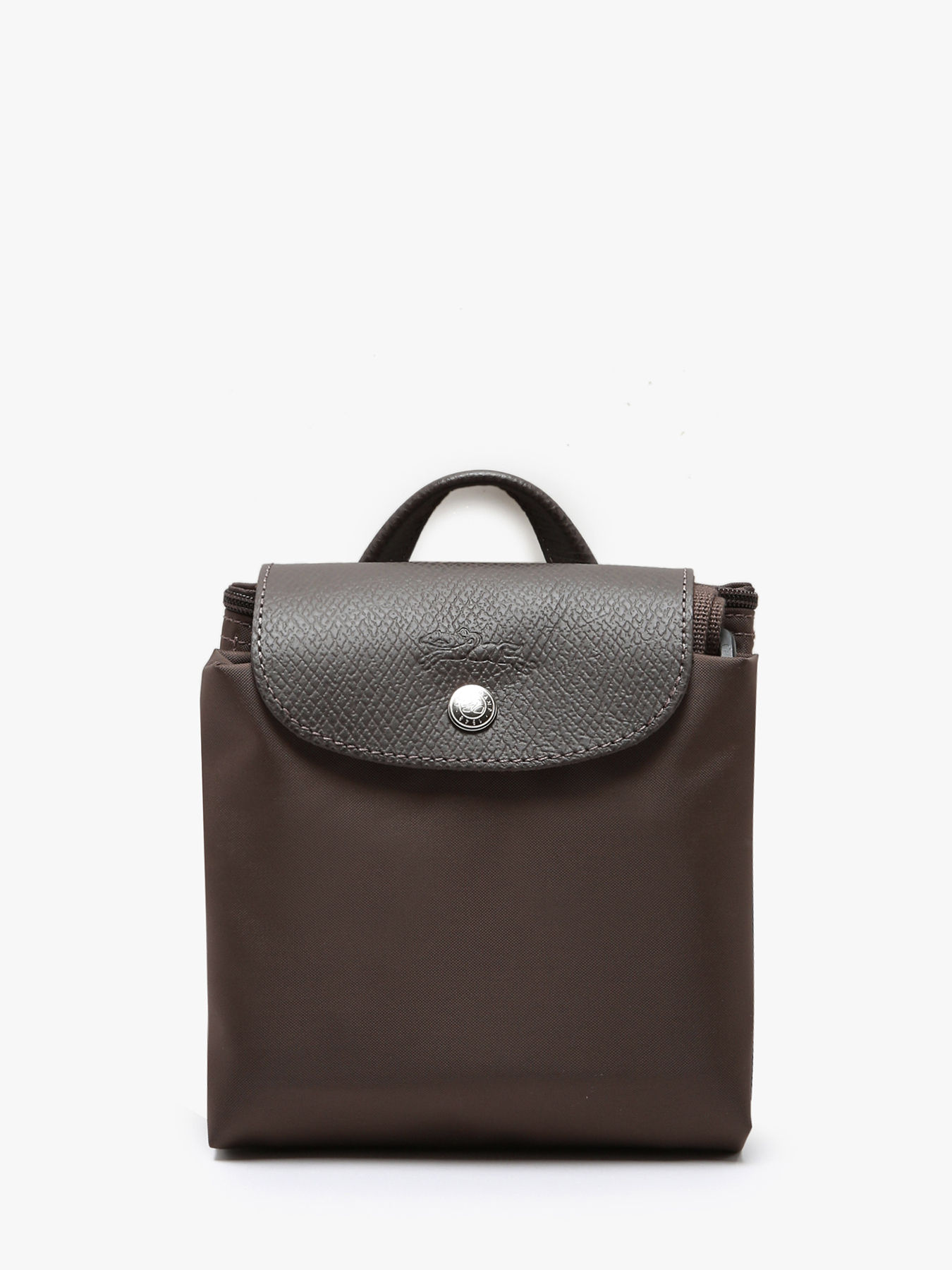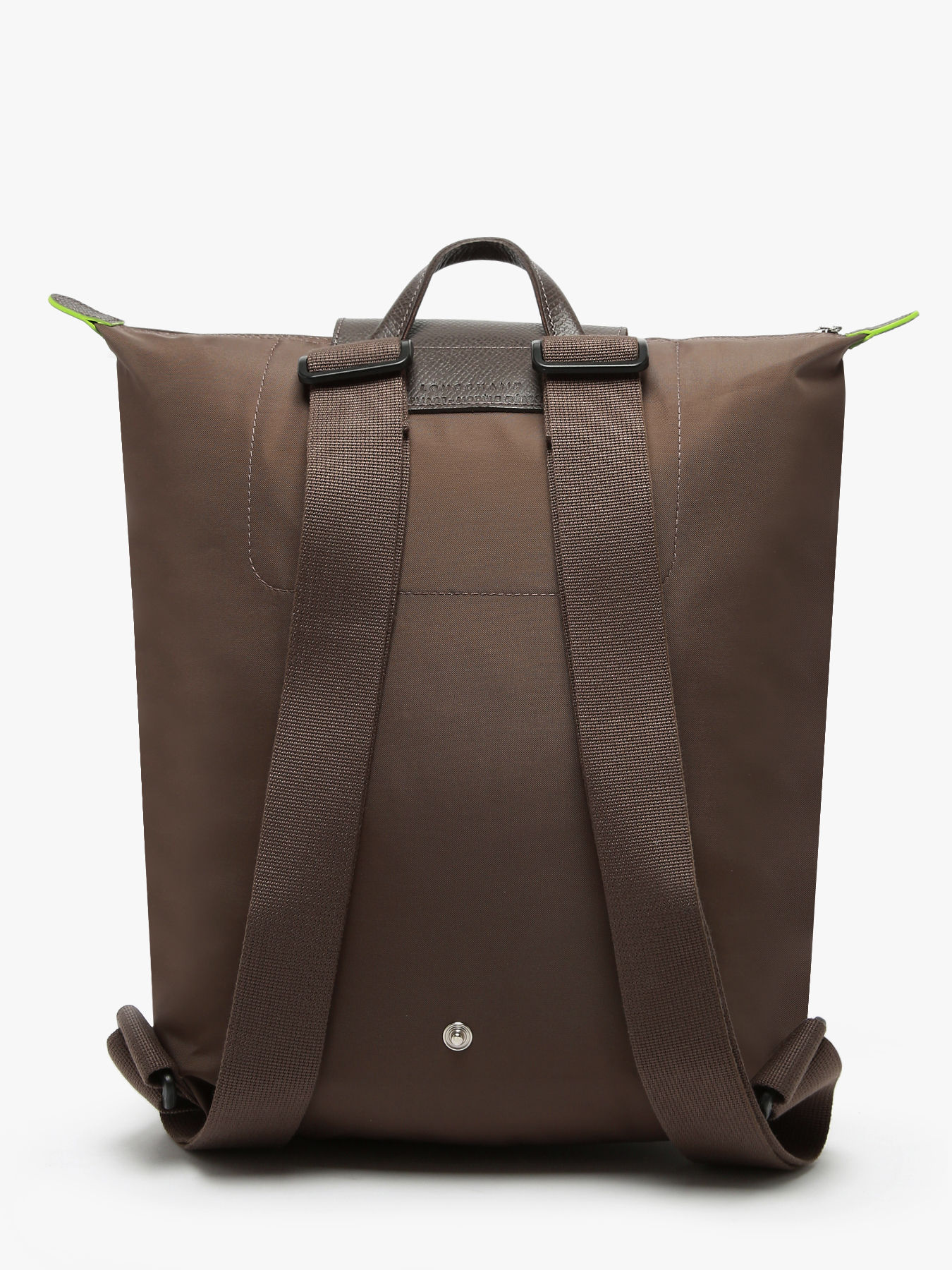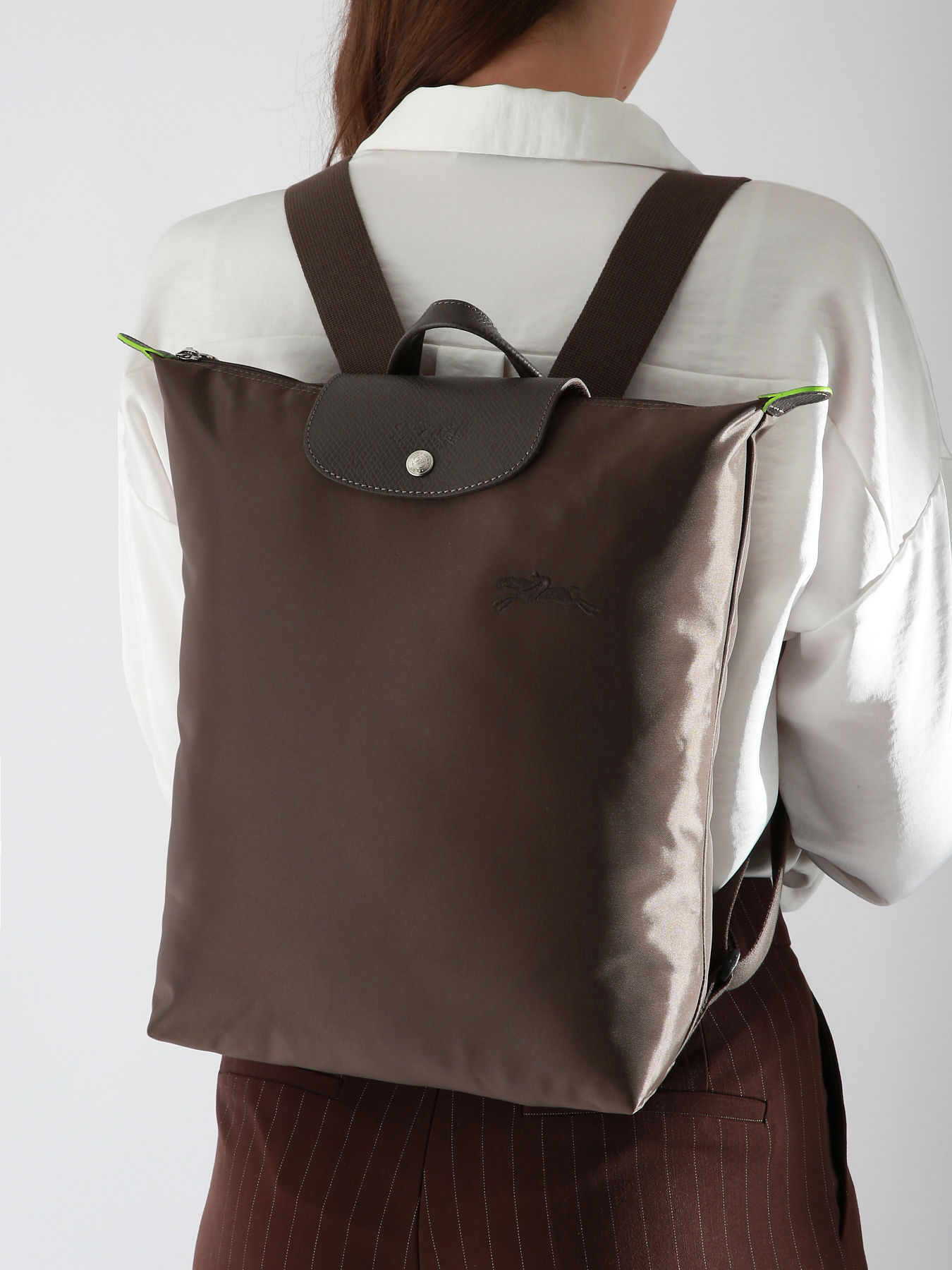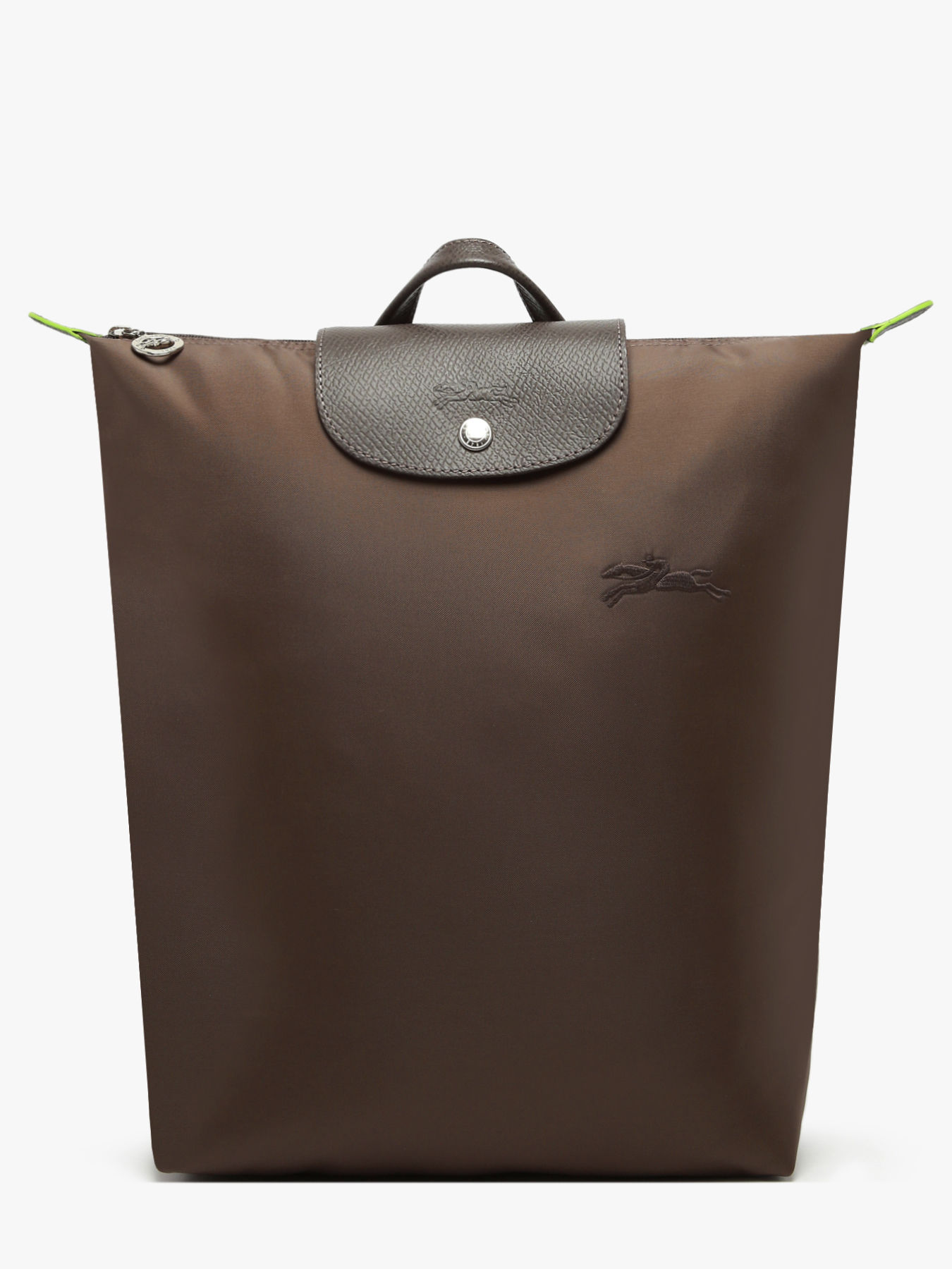 The M Le Pliage backpack from Longchamp combines lightness, practicality, and environmental responsibility. Made from recycled nylon and leather trim, this backpack features a zip closure, a flap with a press stud, and adjustable straps for optimal comfort. Its spacious design accommodates a 16-inch laptop and other essentials, while its tonal color palette and the embroidered Longchamp horse add an elegant and modern touch. Lightweight and foldable, this bag embodies the dynamic and creative spirit of the brand. The Pliage Green line is an eco-friendly model, featuring a polyamide fabric certified GRS 4.0, ensuring durability and respect for natural resources. The green edge dyeing and leather trim highlight Longchamp's unique style and ecological commitment, offering a chic, responsible look.