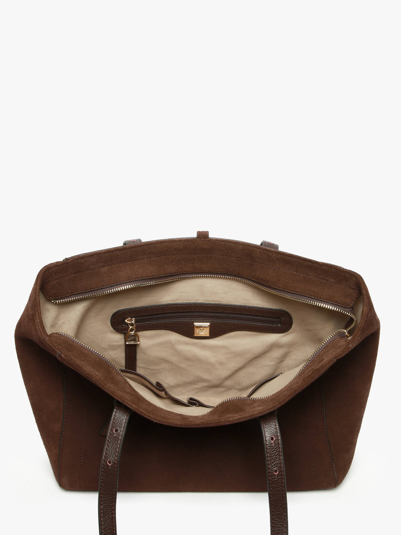 The ETRIER shoulder bag from the ALTESSE SUEDE line is crafted from soft velvety leather. It features a tote shape ideal for everyday use. It closes with a zipper and is adorned with a stirrup-shaped pendant, the elegant signature of the House. Inside, a spacious compartment includes two slip pockets and a zipped pocket for optimal organization. It also offers a generous size that can accommodate A4 documents as well as a laptop up to 13 inches. The back of the bag is made of grained leather for enhanced durability. The ALTESSE SUEDE line revisits the ETRIER icon with a warm texture and a ""Highlander Cowboy"" spirit, blending refinement and character.